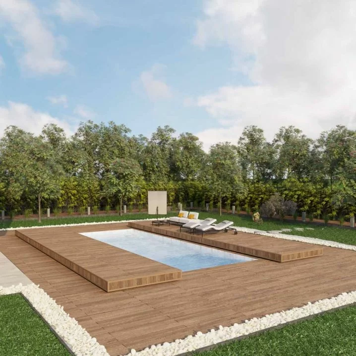 Ідеальна для покриття стаціонарних басейнів шириною до 8 м і довжиною до 10 м. Конструкція з двох рухомих частин з оцинкованої сталі та терасної дошки забезпечує теплоізоляцію та герметичність, перешкоджаючи випаровуванню води.