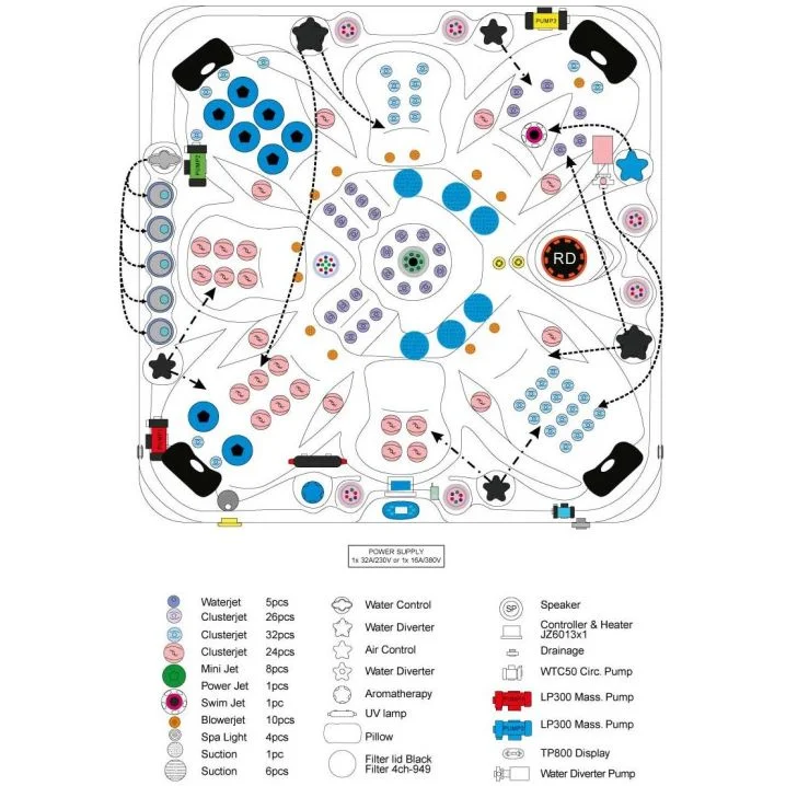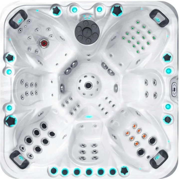 Розміри: 224х224х91 см, об'єм: 1450 л, кількість масажних форсунок: 104 (92 водних, 12 повітряних).