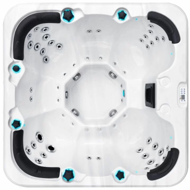 Сучасний СПА-басейн з глибокими ковшоподібними сидіннями, 7 місцями та регульованими форсунками.
