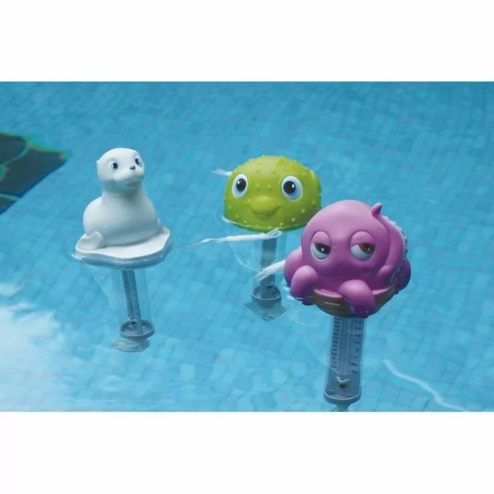 Плаваючий термометр іграшка Kokido K265DIS/6P Тюлень для басейну. Виготовлений з нешкідливого полімеру, не містить скла, ртуті або гострих частин. Має дві шкали - Цельсія і Фаренгейта. Обладнаний плавучим шнурком, який кріпиться до стінки басейну.
