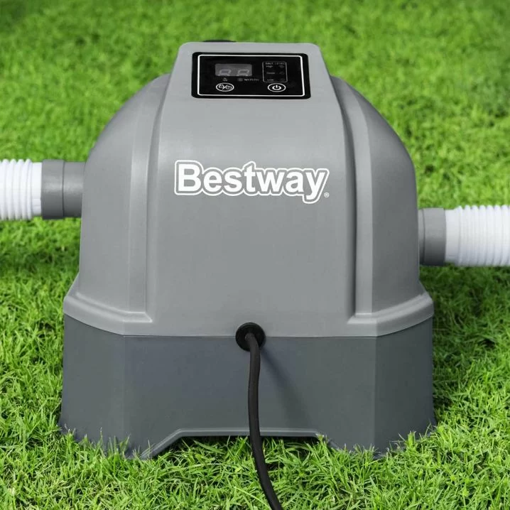 Виріб забезпечує автоматичну дезінфекцію води, використовуючи сіль для виробництва хлору. Це зменшує потребу в хімічних очищувальних засобах.