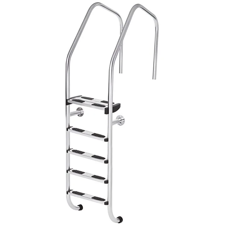 Призначені для заглиблених басейнів з широким бортом, ці сходи оснащені п’ятьма сходинками з протиковзними пластиковими накладками. Завдяки гумовим заглушкам, кріплення не порушує гідроізоляцію чаші басейну.