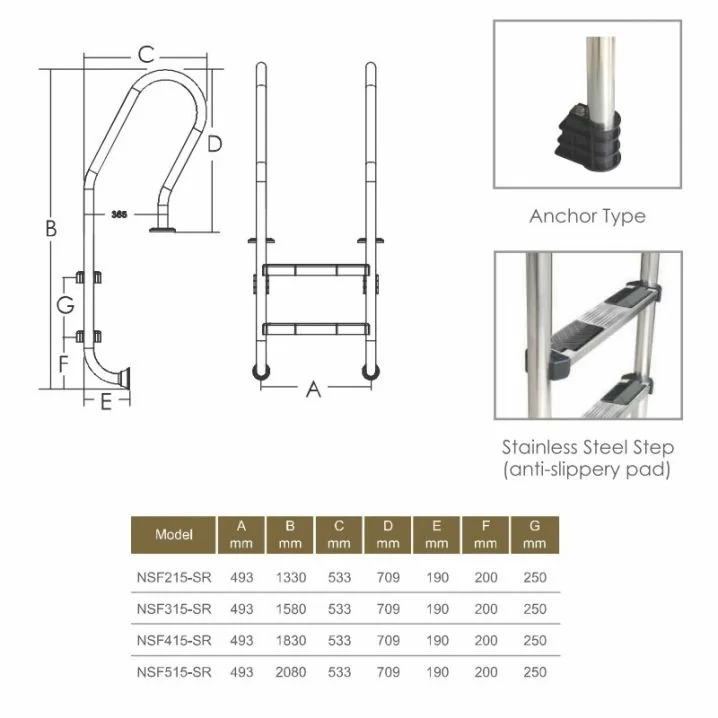 Модель NSF215-SR забезпечує зручний та безпечний спуск в басейн. Сходинки і поручні виготовлені з полірованої нержавіючої сталі AISI-304, що забезпечує довговічність.