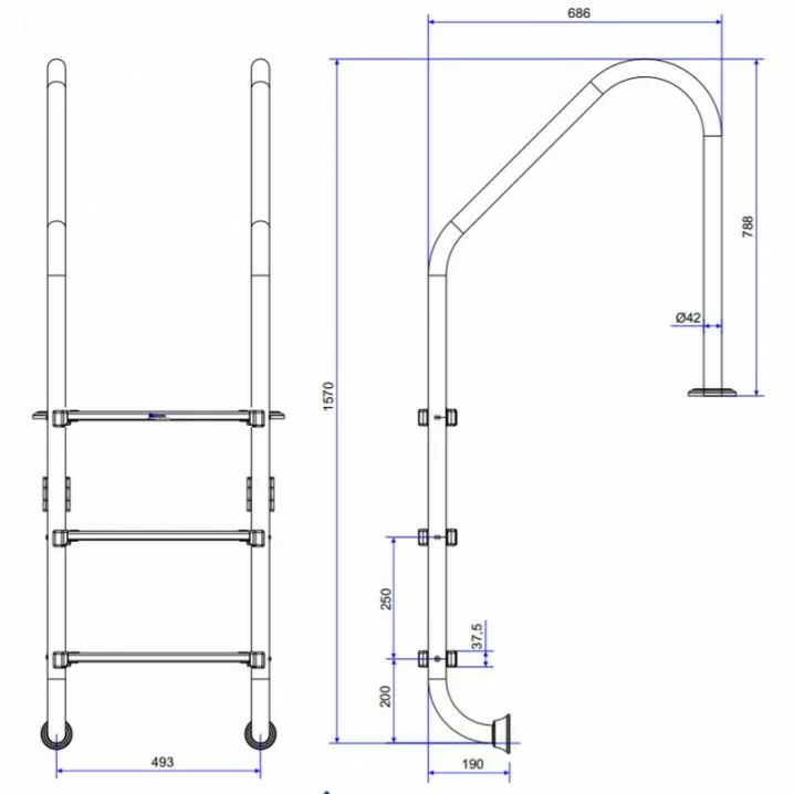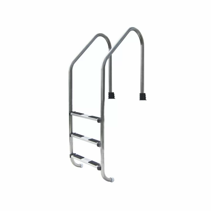 Для зручного та безпечного спуску в басейн, дані сходи виготовлені з полірованої нержавіючої сталі марки AISI-304. Поручні кріпляться до борту за допомогою пластикових склянок, а нижня частина впирається в стіну басейну прогумованою заглушкою.