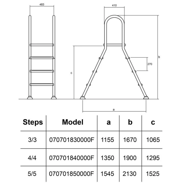 Маса – 23 кг, з максимальним навантаженням до 150 кг. Сходи витримують температуру навколишнього середовища від 0 до +50ºC та воду від +2 до +45ºC.