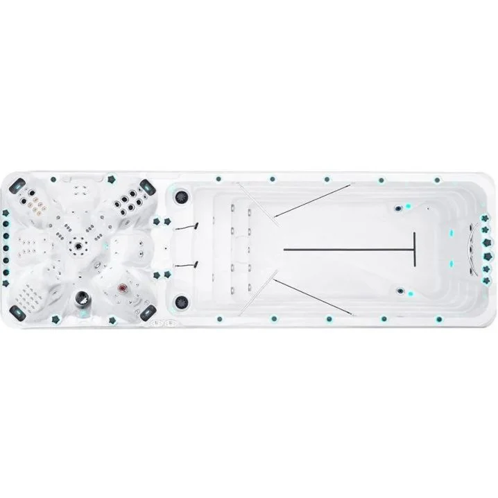 Сучасний СПА-басейн з сімома ковшоподібними сидіннями і масажними форсунками, що пропонує місце для плавання.