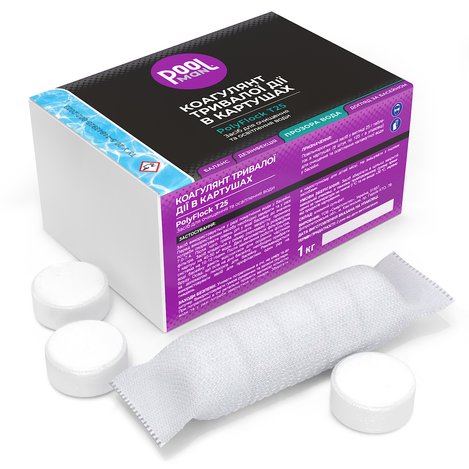 Призначення: Повільнорозчинний засіб у вигляді 25 г таблеток в картушах (8 штук по 125 г в упаковці) для очищення та освітлення каламутної води у басейні.