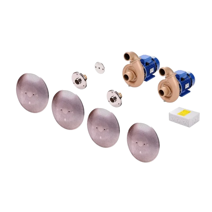 Лицьові частини з нержавіючої сталі 316L, насос і фітинги з бронзового сплаву, що стійкий до корозії. Продуктивність: 120 м³/год, потужність: 2 x 2.6 кВт, живлення: 380 В.