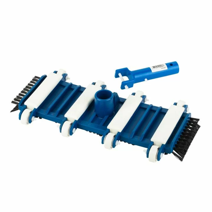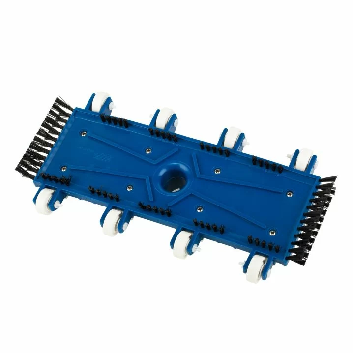 Щітка призначена для ручного пилососа для басейну. Має обважений сталевий вантаж із захисним покриттям. Корпус щітки гнучкий, оснащений 8 коліщатками для легкого переміщення по дну басейну. Має нижній і боковий ворс для чищення дна та прилеглих кутів басейну.