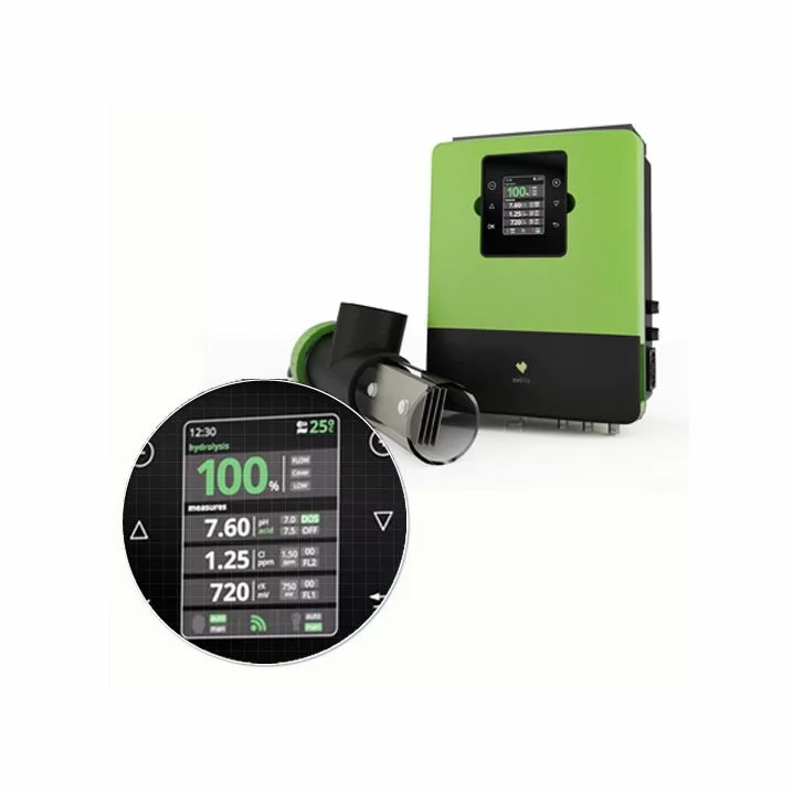 Станція Oxilife поєднує сучасну технологію гідролізу для знезараження води без хлору та інтелектуальне керування основним і допоміжним обладнанням басейну. Вироблено в Іспанії, оснащено кольоровим LCD-дисплеєм 2,8", самодіагностикою та самоочищенням електродів.