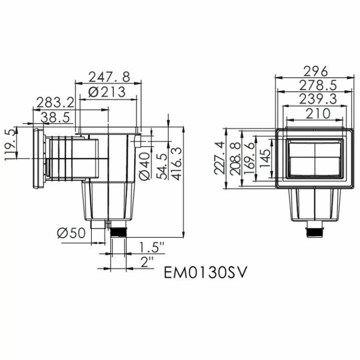 Скімер Emaux під лайнер Standart EM0130-SV з квадратною кришкою. Виготовлений з міцного ABS пластику, стійкого до ультрафіолету, тиску води і хімічних реагентів. Матеріал: ABS пластик + латуньНижнє з'єднання: 1½"/2"Нижнє з'єднання: діаметр 50 мм