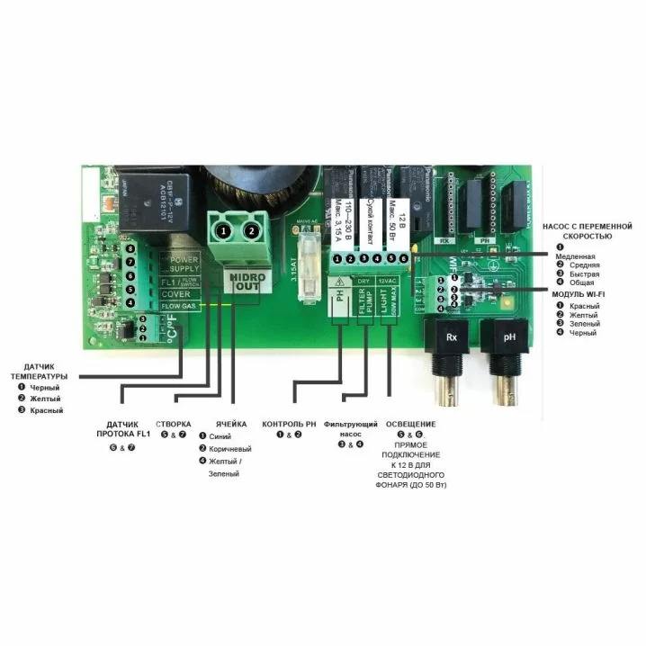 Система обробки та стерилізації води забезпечує управління хлоратором, температурою, освітленням і фільтрацією, призначена для басейнів об'ємом до 65 м³.