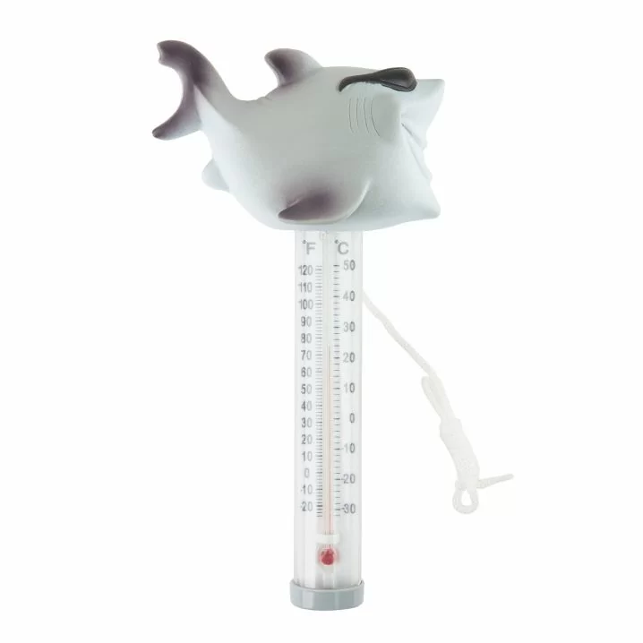 Плаваючий термометр іграшка Kokido K725DIS/6P Акула для басейну. Виготовлений з нешкідливого полімеру, не містить скла, ртуті або гострих частин. Має дві шкали - Цельсія і Фаренгейта. Обладнаний плавучим шнурком, який кріпиться до стінки басейну.