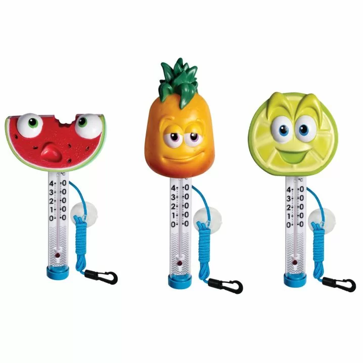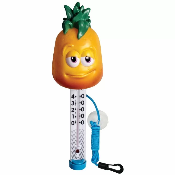 Плаваючий термометр іграшка TM06DIS/C Ананас для басейну. Виготовлений з нешкідливого полімеру, не містить скла, ртуті або гострих частин. Обладнаний плавучим шнурком, який кріпиться до стінки басейну.