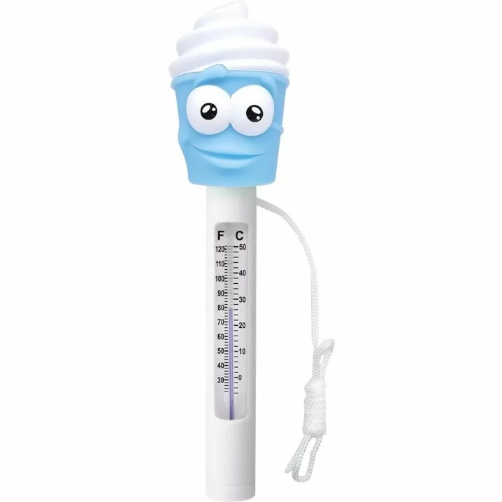 Плаваючий термометр іграшка TM09DIS Морозиво для басейну. Виготовлений з нешкідливого полімеру, не містить скла, ртуті або гострих частин. Має дві шкали - Цельсія та Фаренгейта. Обладнаний плавучим шнурком, який кріпиться до стінки басейну.