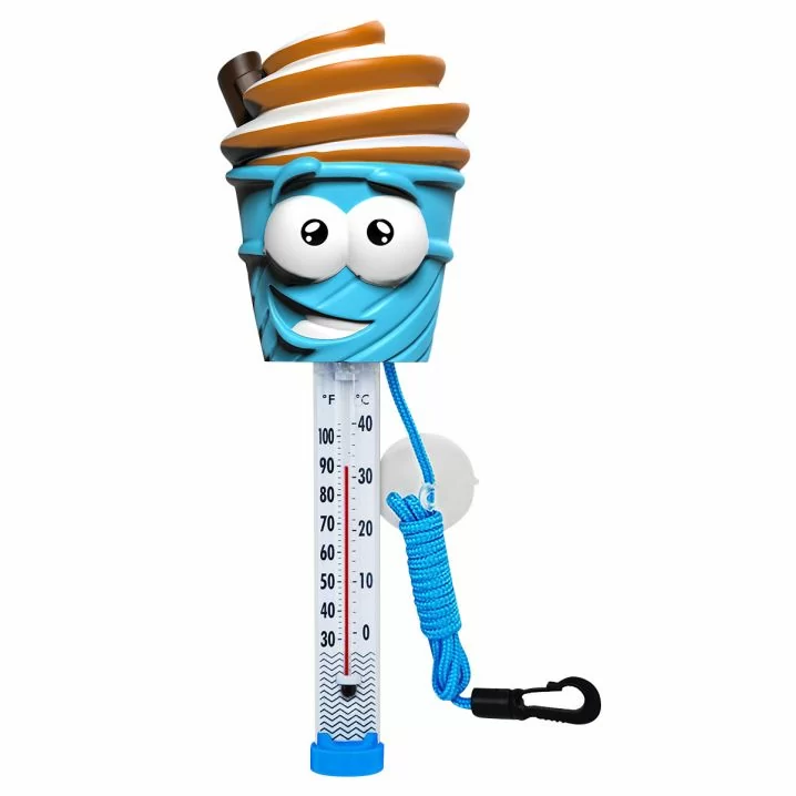Плаваючий термометр іграшка TM10DIS/C Морозиво для басейну. Виготовлений з нешкідливого полімеру, не містить скла, ртуті або гострих частин. Обладнаний плавучим шнурком, який кріпиться до стінки басейну.