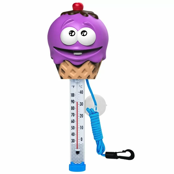 Плаваючий термометр іграшка TM10DIS/C Ріжок для басейну. Виготовлений з нешкідливого полімеру, не містить скла, ртуті або гострих частин. Має дві шкали - Цельсія та Фаренгейта. Обладнаний плавучим шнурком, який кріпиться до стінки басейну.