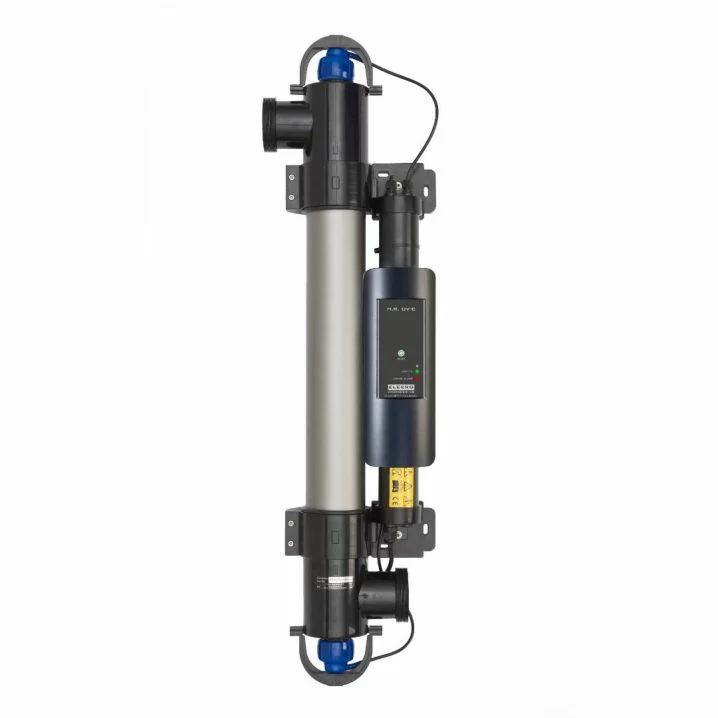 Установка підходить для роботи з солоною і морською водою завдяки відсутності металів на проточній поверхні. Обладнана лічильником терміну служби лампи і перемикачем скидання відпрацьованого часу.