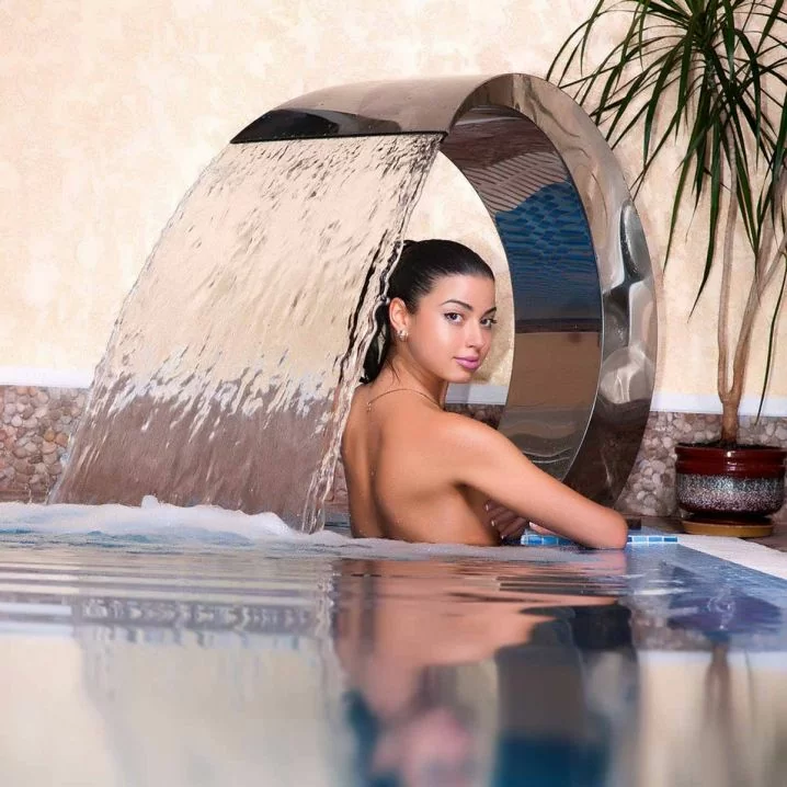 Цей водоспад є відмінним варіантом для прикраси зони басейну, формуючи потік води з масажними властивостями, що додає естетики.