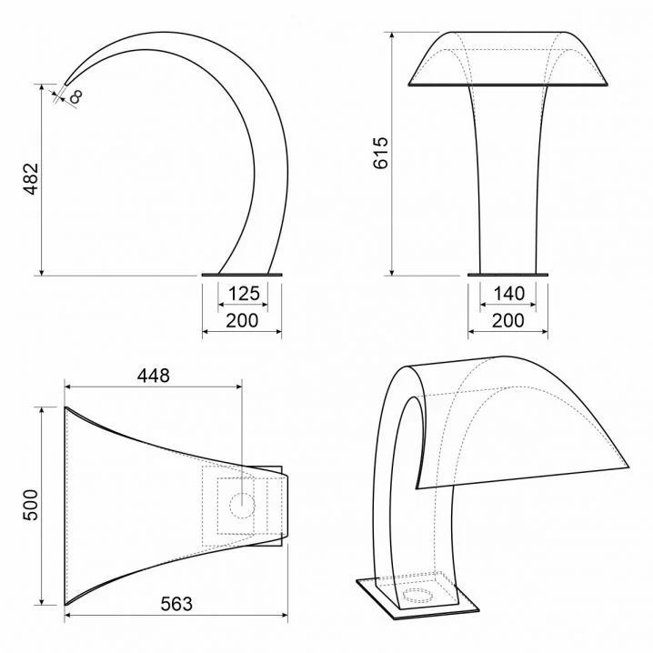 Виготовлений з нержавіючої сталі AISI 304, він стійкий до корозії та ультрафіолету. Розміри: висота - 615 мм, ширина сопла - 500 мм, основа - 200х200 мм, що забезпечує зручність установки в обмеженому просторі.